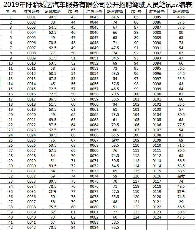 2019年盱眙城運(yùn)汽車服務(wù)有限公司公開招聘駕駛?cè)藛T筆試已于2019年9月10日結(jié)束,現(xiàn)將考生的筆試成績予以公布。