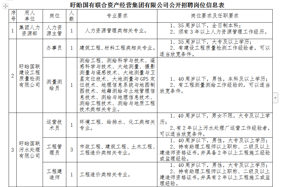 本次招聘具體崗位及條件詳見《盱眙國有聯(lián)合資產(chǎn)經(jīng)營集團有限公司公開招聘崗位信息表》(附件1)。