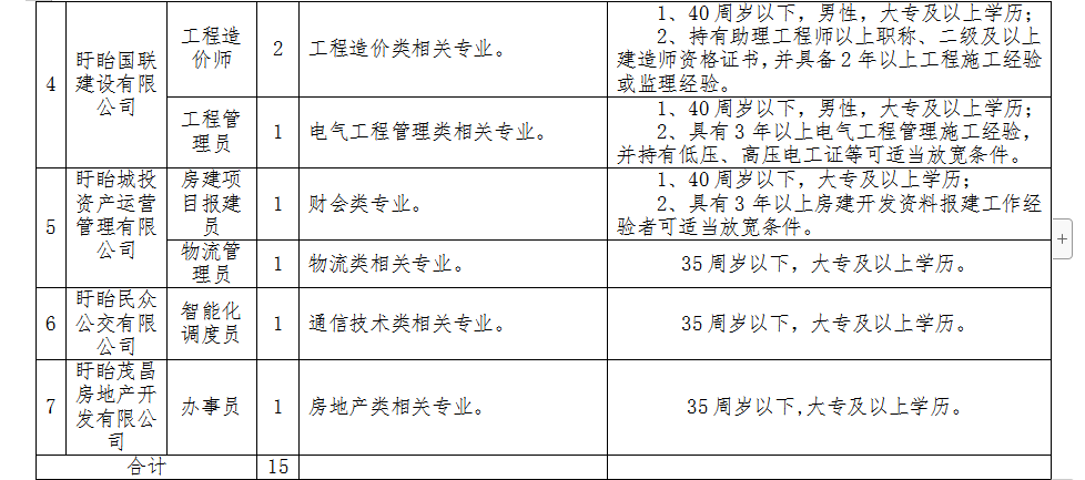 因業(yè)務發(fā)展需要,盱眙國有聯(lián)合資產(chǎn)經(jīng)營集團有限公司決定面向社會公開招聘工作人員15名。 一、招聘崗位及條件 本次招聘具體崗位及條件詳見《盱眙國有聯(lián)合資產(chǎn)經(jīng)營集團有限公司公