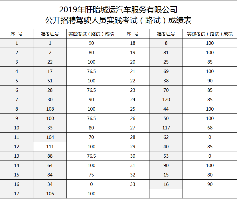 2019年盱眙城運(yùn)汽車(chē)服務(wù)有限公司公開(kāi)招聘駕駛?cè)藛T實(shí)踐考試(路試)已于2019年9月16日下午結(jié)束,現(xiàn)將考生的實(shí)踐考試(路試)成績(jī)予以公布。
